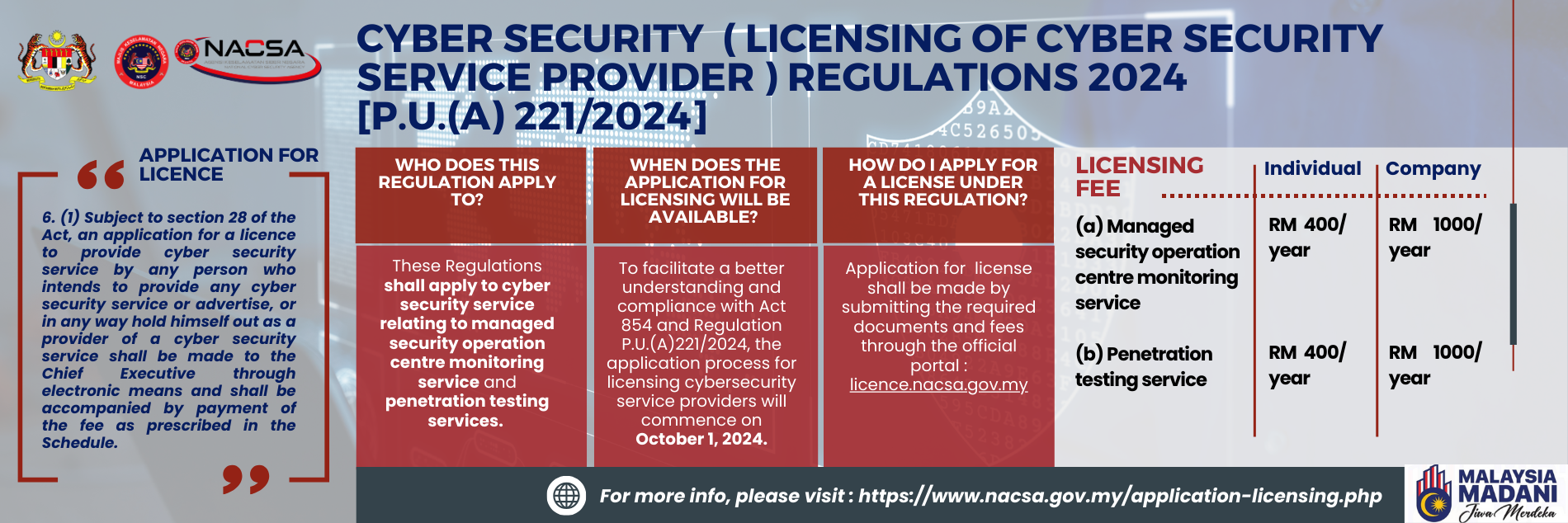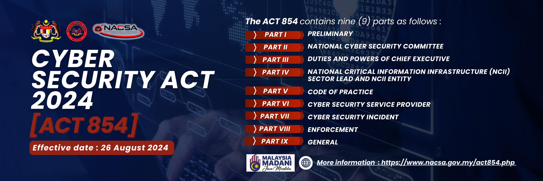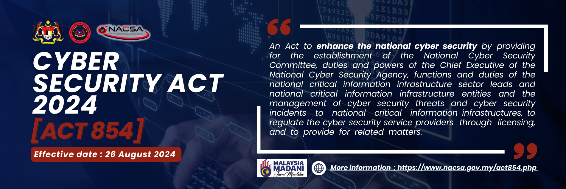 The National Cyber Security Agency (NACSA) was officially established in February 2017 as the national lead agency for cyber security matters, with the objectives of securing and strengthening Malaysia's resilience in facing the threats of cyber attacks, by co-ordinating and consolidating the nation's best experts and resources in the field of cyber security.