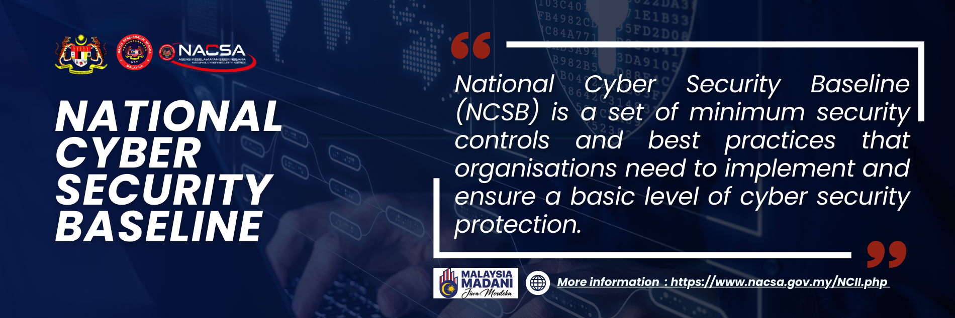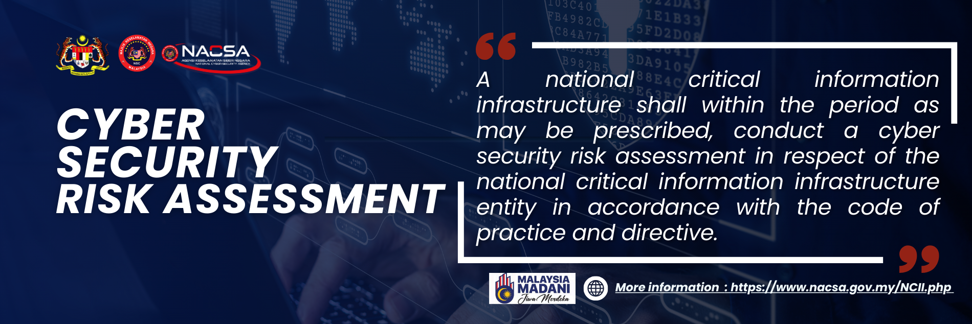NACSA is also committed to developing and implementing national-level cyber security policies and strategies, protecting National Critical Information Infrastructures (NCII), undertaking strategic measures in countering cyber threats, spearheading cyber security awareness, acculturation and capacity-building programmes, formulating strategic approach towards combatting cyber crimes, advising on organizational cyber risk management, developing and optimizing shared resources among agencies, and fostering constructive regional and global networks among entities with shared interests in cyber security.